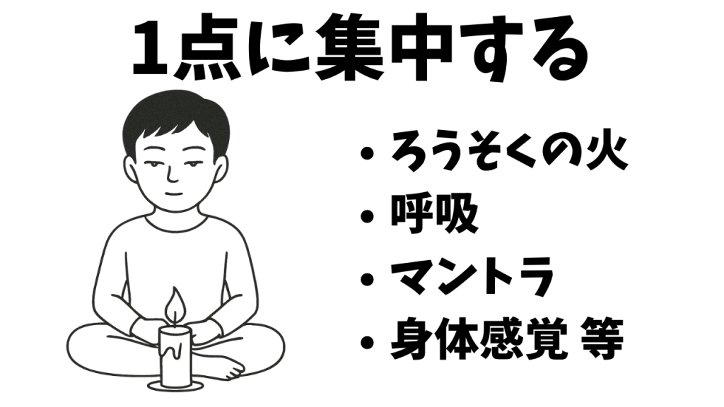 呼吸、炎、マントラ、音、身体感覚など、視覚・聴覚・触覚に関する対象を使って、心の注意を一箇所に向けます。