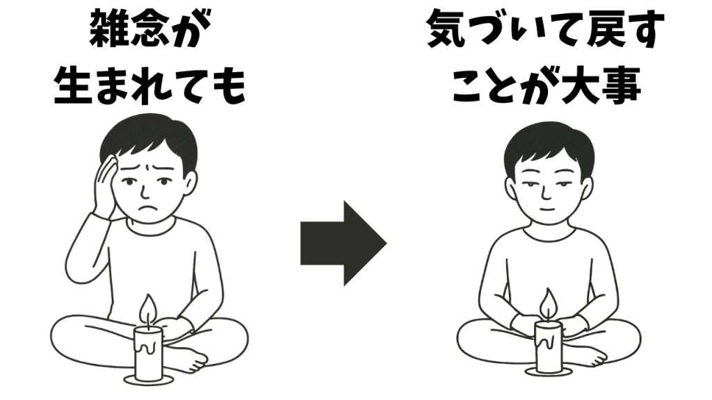 その気づきがあるたびに、呼吸や集中対象へ意識を優しく戻しましょう。